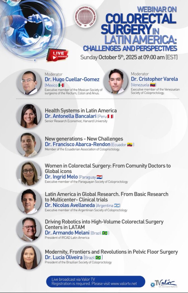 El 5 de octubre de 2025 tuve el honor de participar como disertante invitado en el webinar internacional “Colorectal Surgery in Latin America: Challenges and Perspectives”, transmitido en vivo por Valor TV y organizado por la Sociedad Universitaria de Cirujanos del Ecuador.
