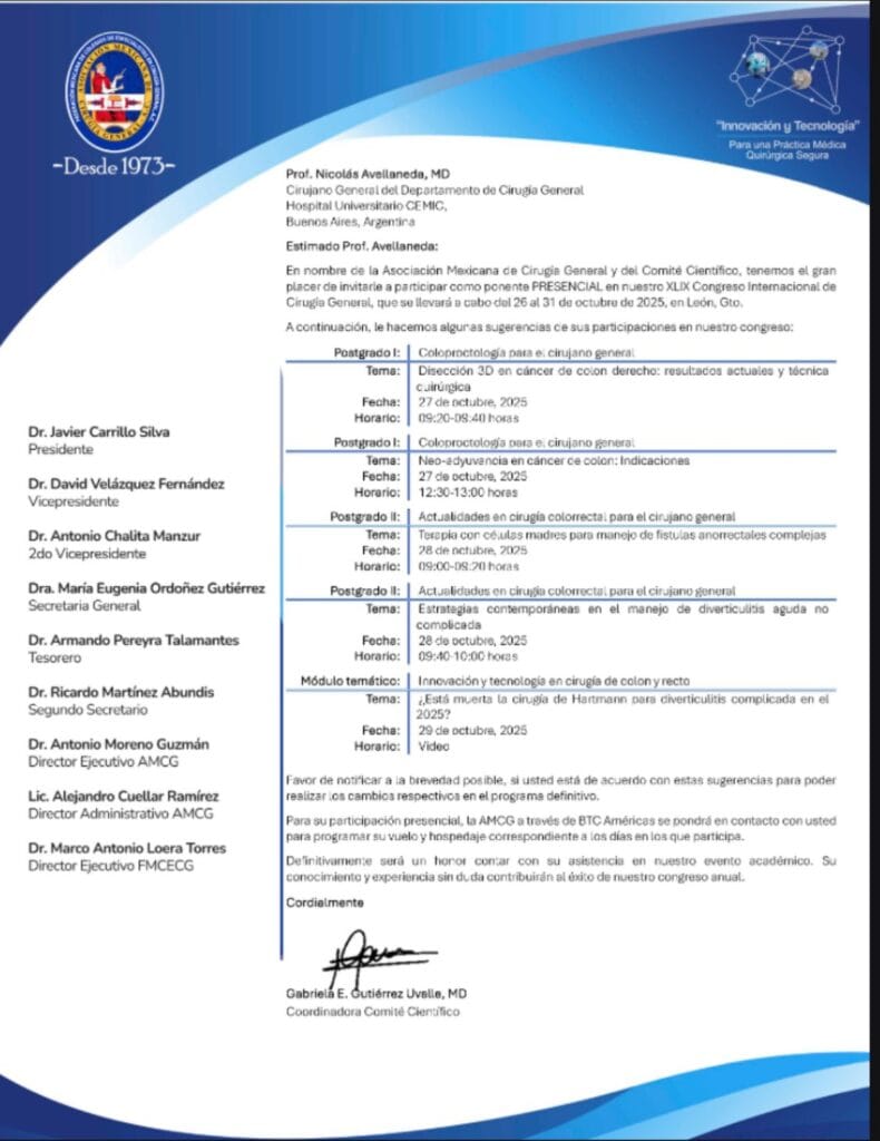 Tuve el honor de participar como ponente invitado en el XLIX Congreso Internacional de Cirugía General, organizado por la Asociación Mexicana de Cirugía General (AMCG), celebrado en la ciudad de León, Guanajuato, del 26 al 31 de octubre de 2025. Este congreso, que reúne a cientos de cirujanos de todo el continente, es uno de los eventos académicos más importantes de Latinoamérica, reconocido por su tradición, su nivel científico y su espíritu de colaboración entre colegas.